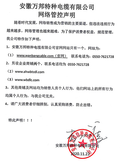 鄭重聲明:安徽萬邦特種電纜有限公司官方網站為:www_wanbangcable_com.zyuemfq.cn,除此之外無任何子網站或合作網站,其余均為假冒偽劣。電話:0550-7621728 13485756353 地 址:安徽省天長市滁州高新技術產業開發區經四路29號
